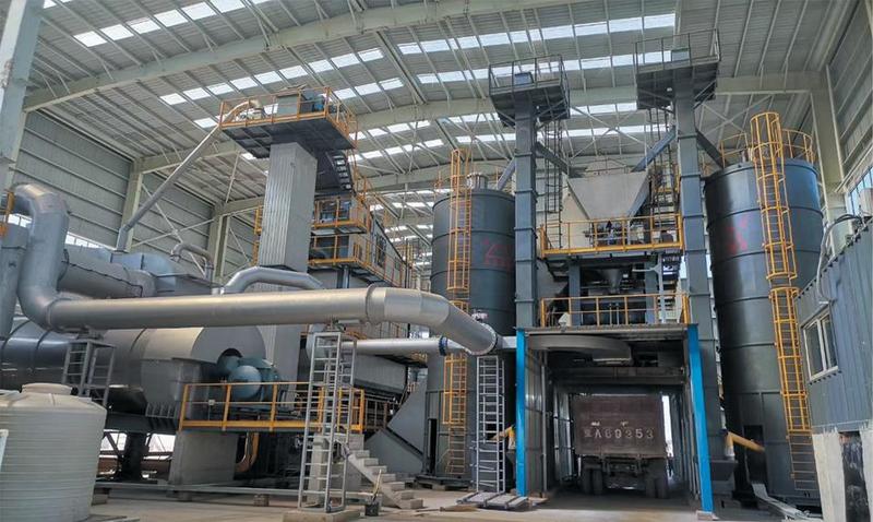 设备高度降低至15米内,分为热料仓主楼、搅拌主楼,热骨料计量后经提升小车运至搅拌主楼(可保证配比的准确性,优于提升机结构)。设备集中放置在工业园区厂房内,实现工业化生产。